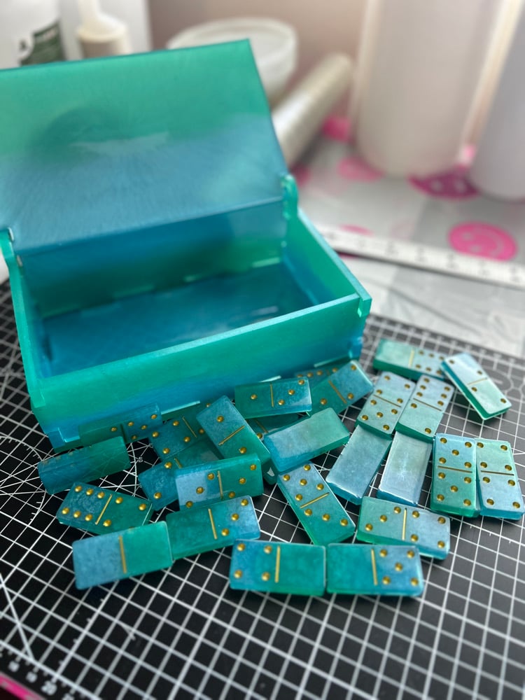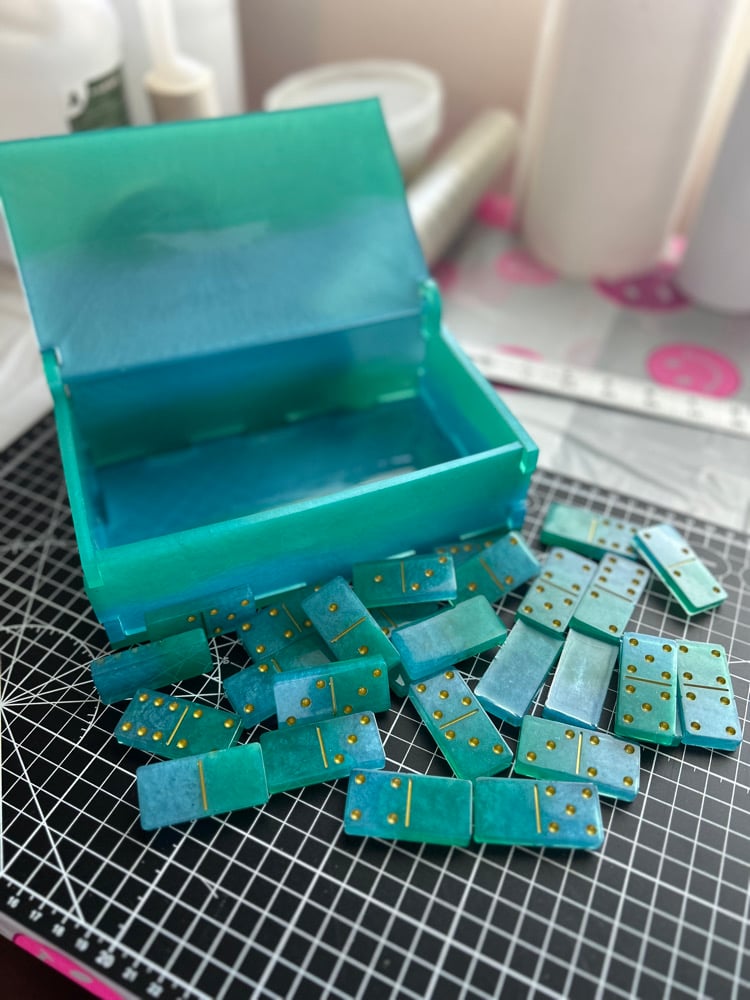 The accompanying resin case is designed to complement the beauty of the domino set while providing a secure and stylish storage solution. With a sleek and durable design, the case ensures that your custom dominos are protected and organized, ready for your next gaming session or display.