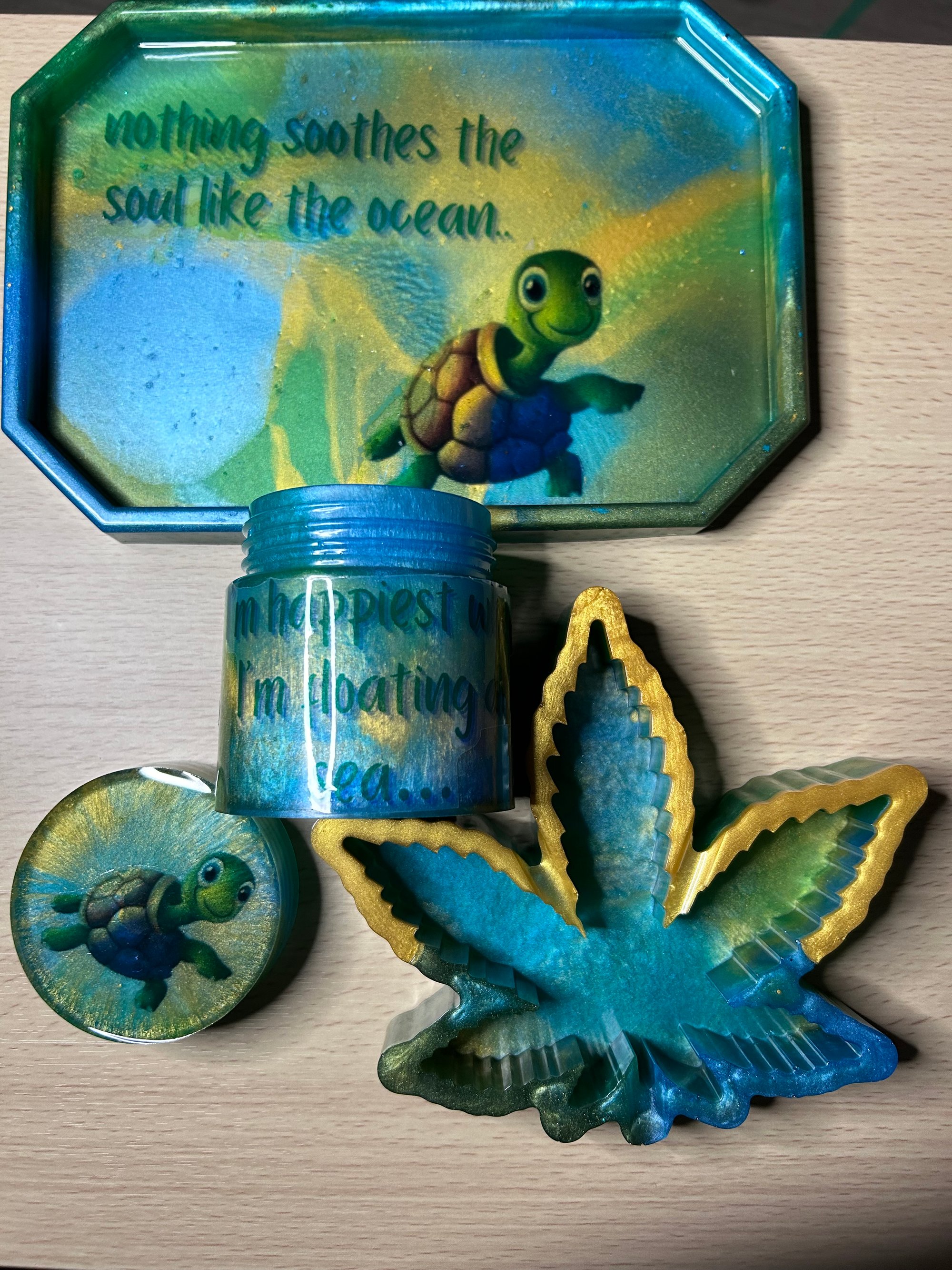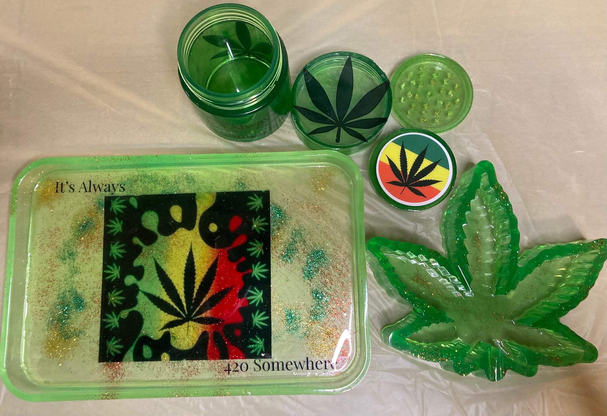 Introducing our stunning Custom Rolling Tray Set complete with a Leaf Ashtray and a meticulously handcrafted jar made from high-quality resin. This remarkable collection is the epitome of functionality and style, designed to elevate your smoking experience to new heights.